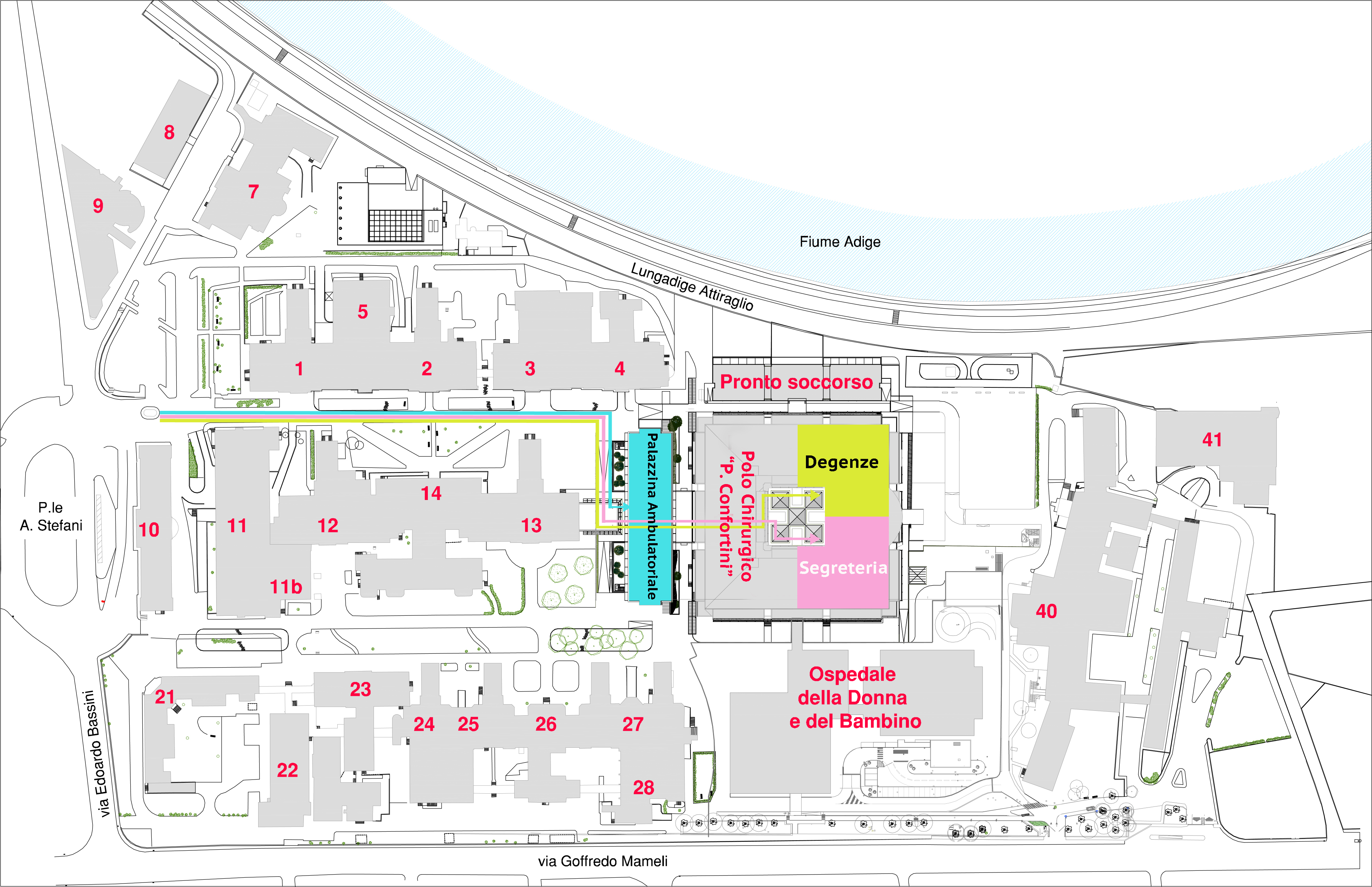 Ambulatori: Polo Chirurgico Confortini, Poliambulatori (n. 24, 25, 28, 29, 30), lato Adige, piano 1